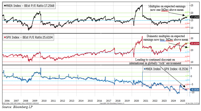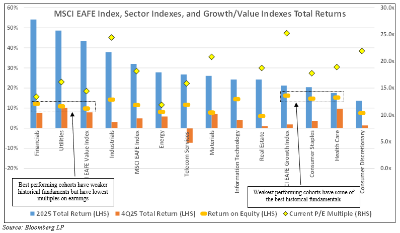 As noted, MSCI EAFE Index delivered a 31.9% total return in USD terms during 2025, driven primarily by valuation re-rating and currency movements rather than fundamental earnings growth. Multiple expansion contributed approximately 16.5% to the returns, as the P/E ratio expanded from 14.8x to 17.2x, while currency effects added 10.1% from the appreciation of EAFE constituent currencies against the USD. In contrast, trailing 12-month earnings per share grew by only 4.5%, contributing modestly to overall performance. As a result, approximately 83% of the total return came from the combination of multiple expansion and favorable currency movements, with a much smaller contribution from earnings growth. The MSIC EAFE Index’s strong performance was overwhelmingly valuation-driven rather than fundamentals-driven.