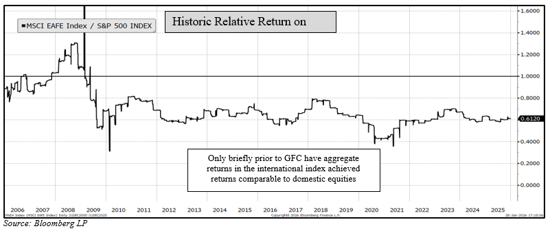International developed markets delivered robust returns in 2025, with the MSCI EAFE Index rising approximately 31.9% for the year and outperforming the S&P 500 for the first time since 2022. The rally was broad-based, supported by strong gains in Europe and the United Kingdom, where the Stoxx Europe 600 achieved 35.2% and the FTSE 100 posted its best annual performance since 2009, gaining 34.2% in total returns in US Dollar terms. Currency strength in these markets contributed to overall performance, as the USD Index fell 10.7% during the first six months of the year.