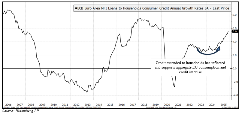 Euro‑area credit data show a modest but broadening in November: adjusted loan growth accelerated to +3.0% YoY (from 2.8%), with +0.4% MoM exhibiting momentum. Corporate credit edged up to +3.1% YoY. Among the “big four,” Germany remains soft, France steadies, Italy improves, and Spain cools slightly. Household lending rose to +2.9% YoY providing support for domestic consumption and residential construction with both mortgages up +2.7% YoY, while consumer credit surged to 5.6% YoY in the Euro-area, according to the most recent European Central Bank data. This mix suggests financing conditions are no longer tightening and beginning to pass through, selectively, to the real economy.