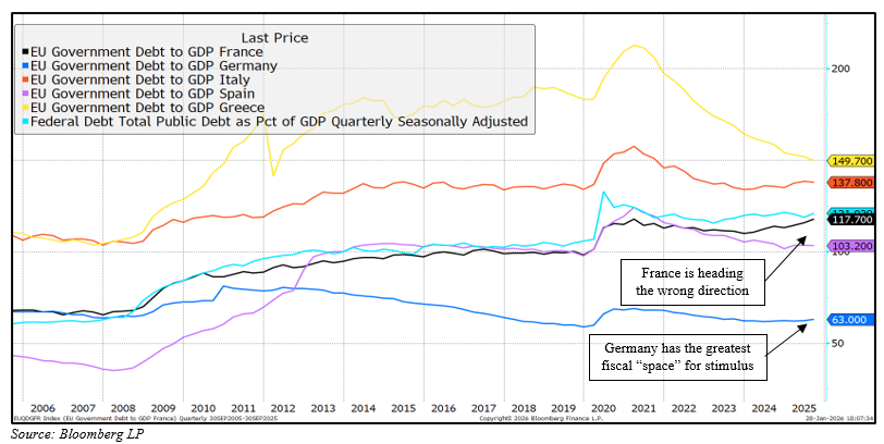 *   Entering 2026, global economic conditions are mixed: Europe sees easing financing but faces fiscal constraints; France struggles with limited fiscal space and low consumer confidence.