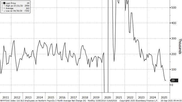 The Federal Reserve lowered its benchmark interest rate by 0.25% at its September meeting, setting the target range at 4.00 to 4.25%. Chairman Powell framed the move as a “risk management cut,” intended to support a softening labor market. The three-month moving average gain in nonfarm payrolls has slipped to roughly 29,000, which is well below the 111,000 monthly job gains the Federal Reserve Bank of Atlanta estimates would be needed to prevent unemployment from rising, assuming labor supply remains unchanged. Part of the slowdown reflects a reduced labor supply, amid significantly less immigration and an increase in deportations.