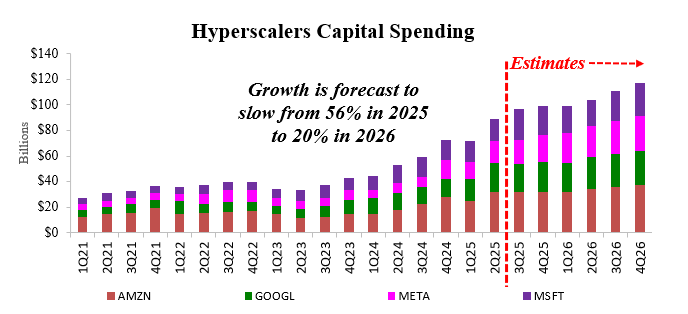 The result is a capital spending super-cycle by the “hyperscalers” of cloud computing: Meta, Amazon, Microsoft, and Alphabet, who are on pace to spend nearly $400 billion this year. That arms race contrasts with their historically capital-expenditure-light, free-cash-flow-rich models, which favor large buybacks. We expect each to be free cash flow positive in 2025, although Amazon will only be marginally positive. At today’s growth rate, capex is unlikely to be sustainable without tapping debt, and it is unclear how far these firms will commit not only current but also future cash flows in the pursuit of AI leadership.