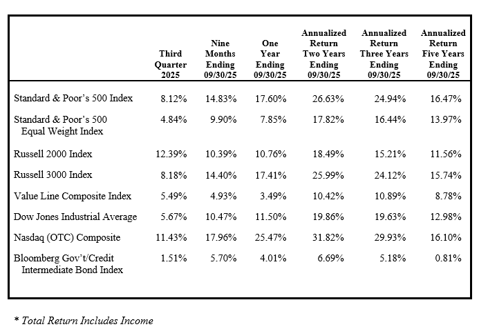 Investors have faced a long list of concerns this year, starting with tariffs, rising geopolitical tensions, inflation, signs of labor-market strain, soft housing data, and now a government shutdown. Despite a sharp market pullback earlier this year with drawdowns of 20% for the Standard & Poor’s 500 Index, 25% for the NASDAQ, and 30% for the Russell 2000, each of these indices reached all-time highs in the third quarter. Market leadership remains concentrated, with the ten largest companies in the Standard & Poor’s 500 Index accounting for 40% of the index value, surpassing the 32% peak reached in 1964. Better-than-expected corporate earnings growth for the largest companies has been a major driver of those gains and has contributed to elevating market concentration.