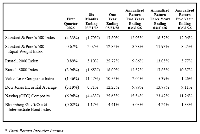 Against this backdrop, the equity market declined in the first quarter, but the magnitude of the pullback was relatively modest given the volume of headline risk. Tariffs, Greenland sovereignty, Federal Reserve independence, and military activity in the Persian Gulf all weighed on investor sentiment. The peak-to-trough decline of the Standard & Poor’s 500 Index in the first quarter was 9.1%, below the average intra-year historical drawdown of nearly 14%. Beneath the surface, however, conditions were far more volatile, with sharp rotations across sectors and market capitalizations.